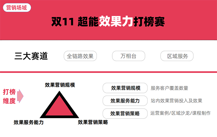 2021双十一已经告一段落,广大生态伙伴在战役复盘之余,也会关注自身沉淀了哪些数字化资产。近日,阿里妈妈首次公布了生态效果力双十一榜单,该榜单排名是根据2021年双十一期间,在效果营销规模、效果服务能力、效果营销策略三大维度评选出的优秀生态伙伴,并对生态伙伴进行总结与回顾,试图从各种微观小趋势中得出大潮向,为后期的数字营销提供科学化决策的参考。